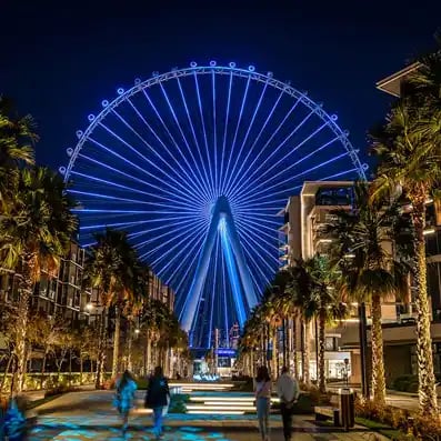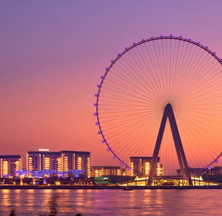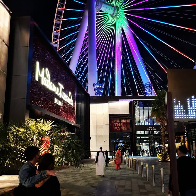 Ain Dubai - The Iconic Observation Wheel: One of the crown jewels of Bluewaters Island is Ain Dubai, the world's largest and tallest observation wheel. Standing at a towering height, this magnificent structure offers unparalleled 360-degree views of Dubai's skyline, the Arabian Gulf, and iconic landmarks such as the Burj Al Arab and Palm Jumeirah. Ain Dubai features luxury cabins equipped with plush seating, fine dining options, and a mesmerizing experience that captures the essence of Dubai's grandeur.